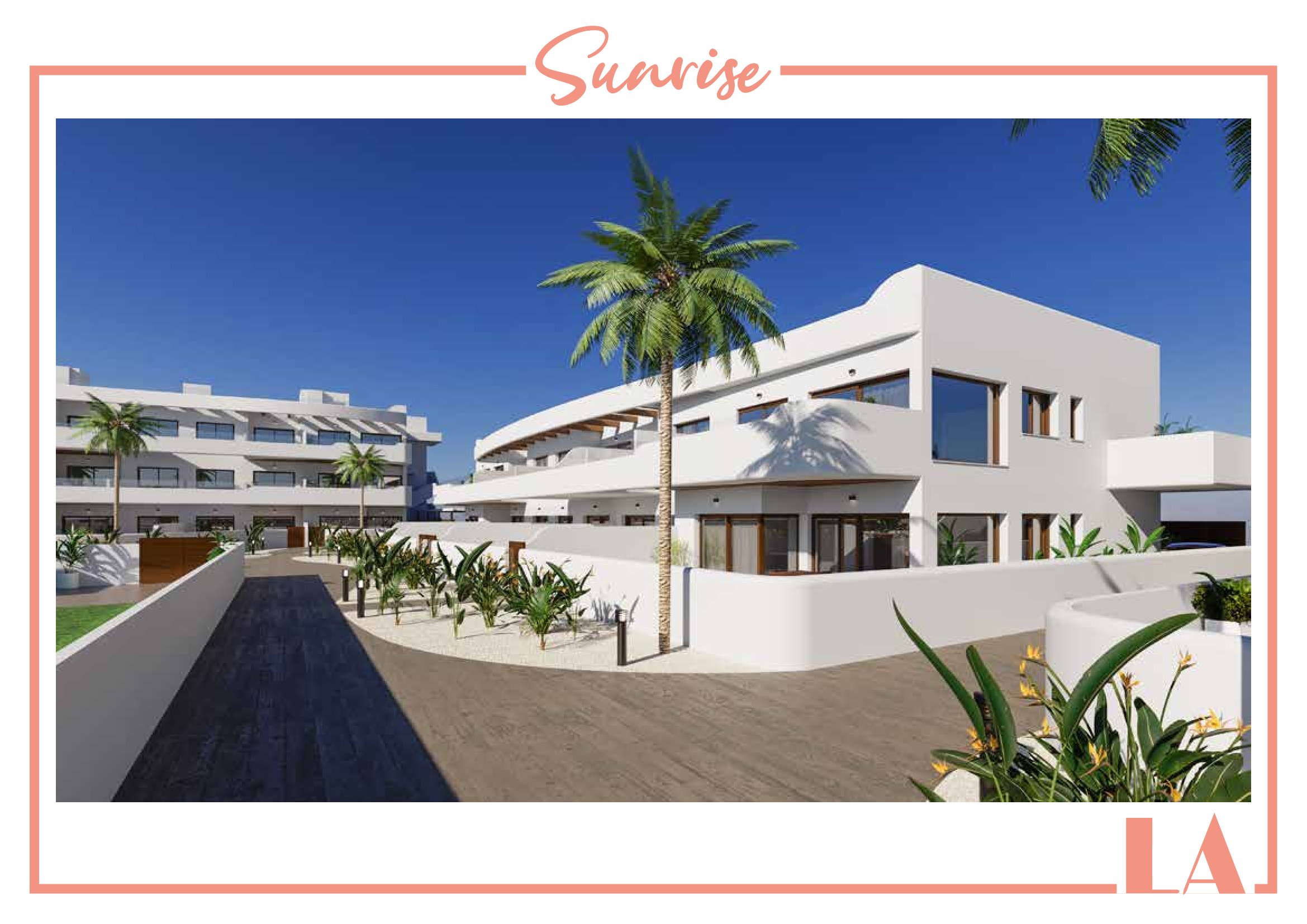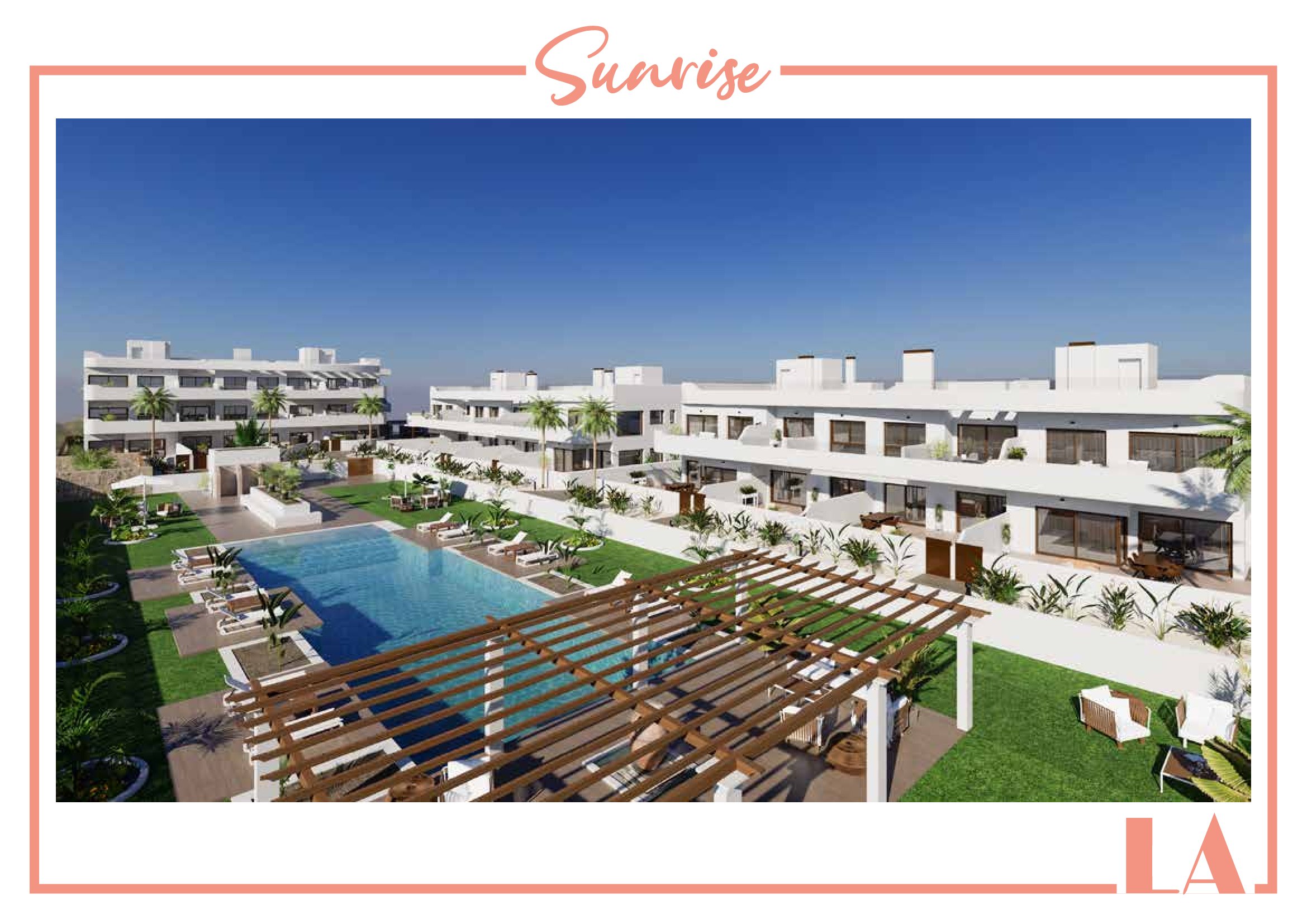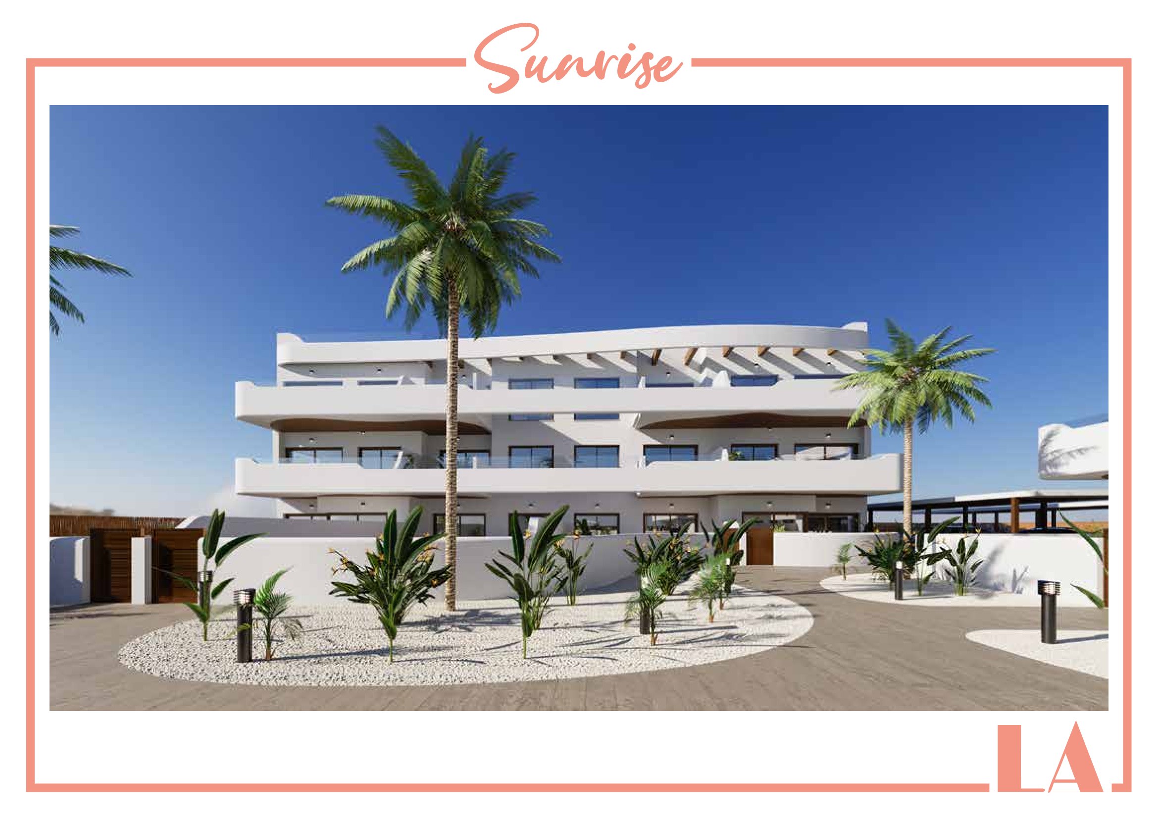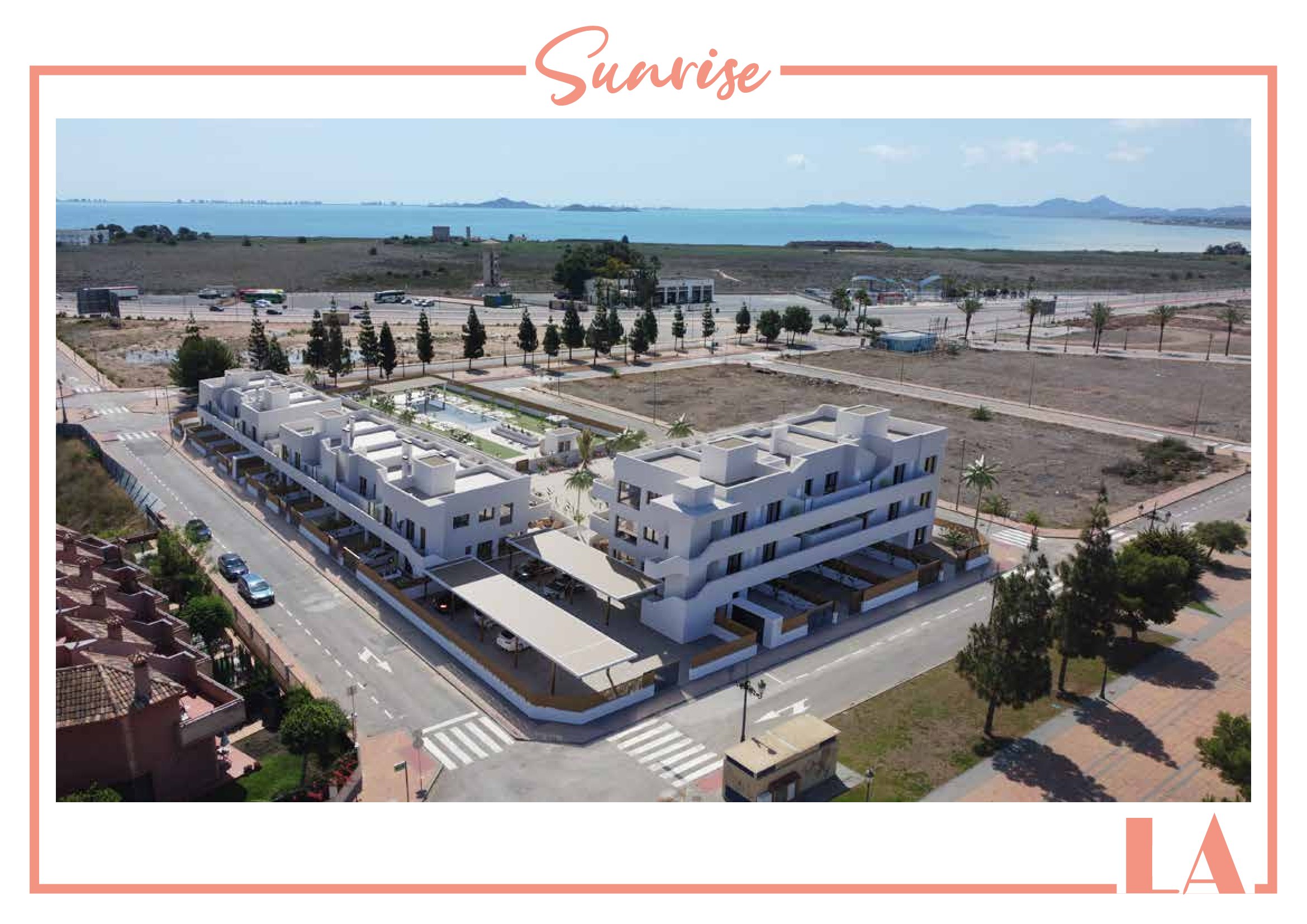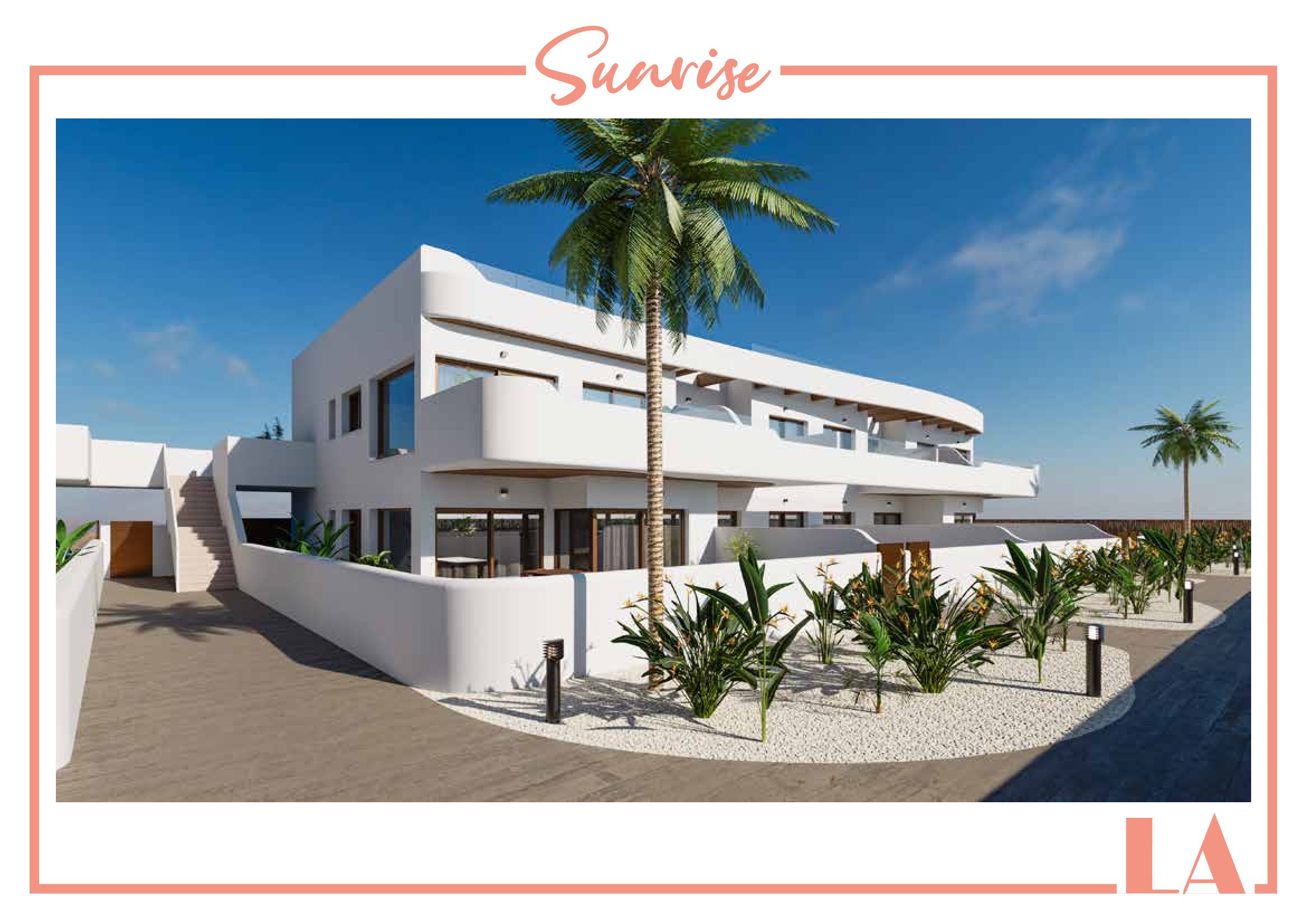 LA Sunrise Apartments have 3 blocks of apartments totaling 30 units with a choice of 3 & 2 bedrooms apartments with 2 bathrooms + private terrace, roof solarium to top floor units plus communal swimming pool and allocated parking. Penthouse units include very impressive roof solariums with outstanding panoramic views over the golf course and the Mar Menor.