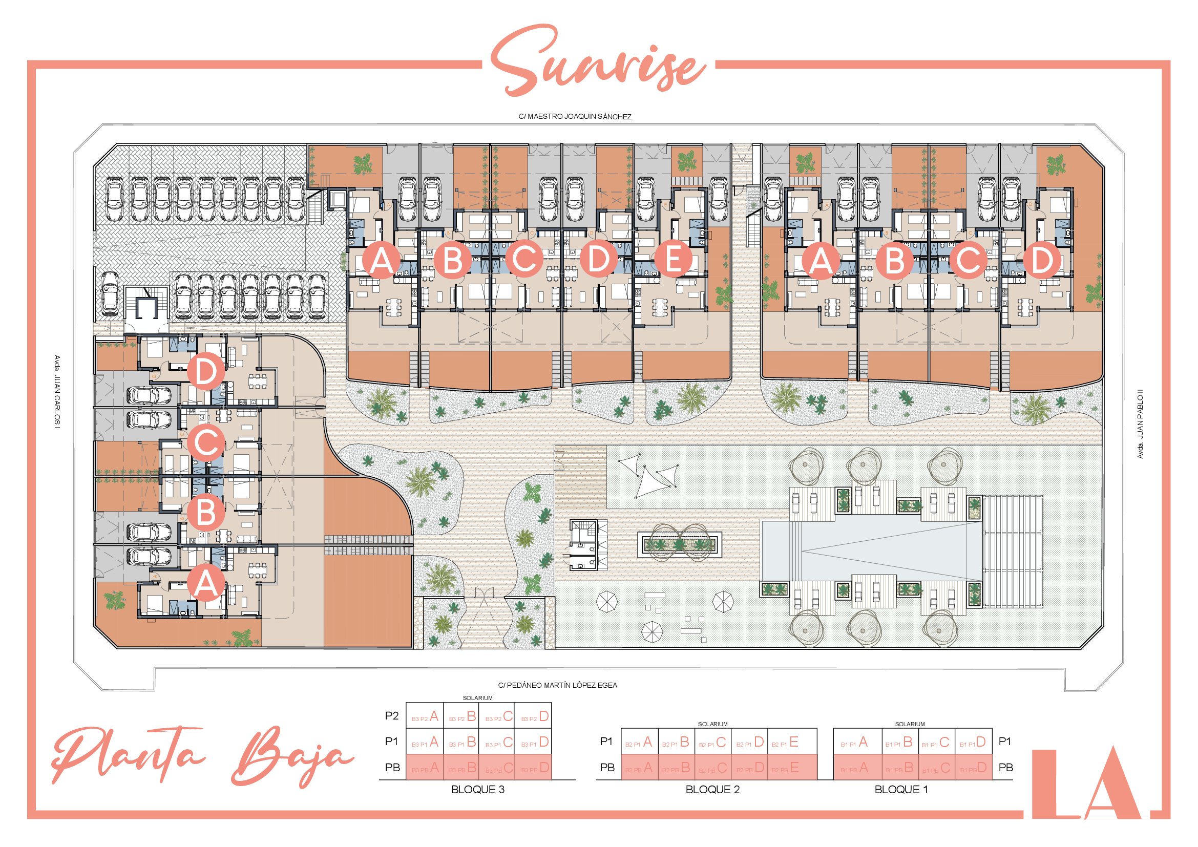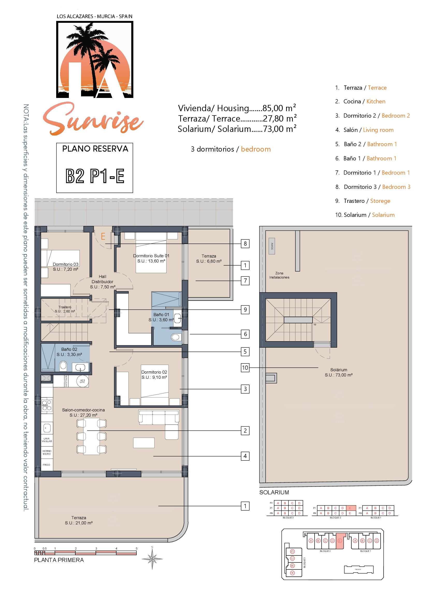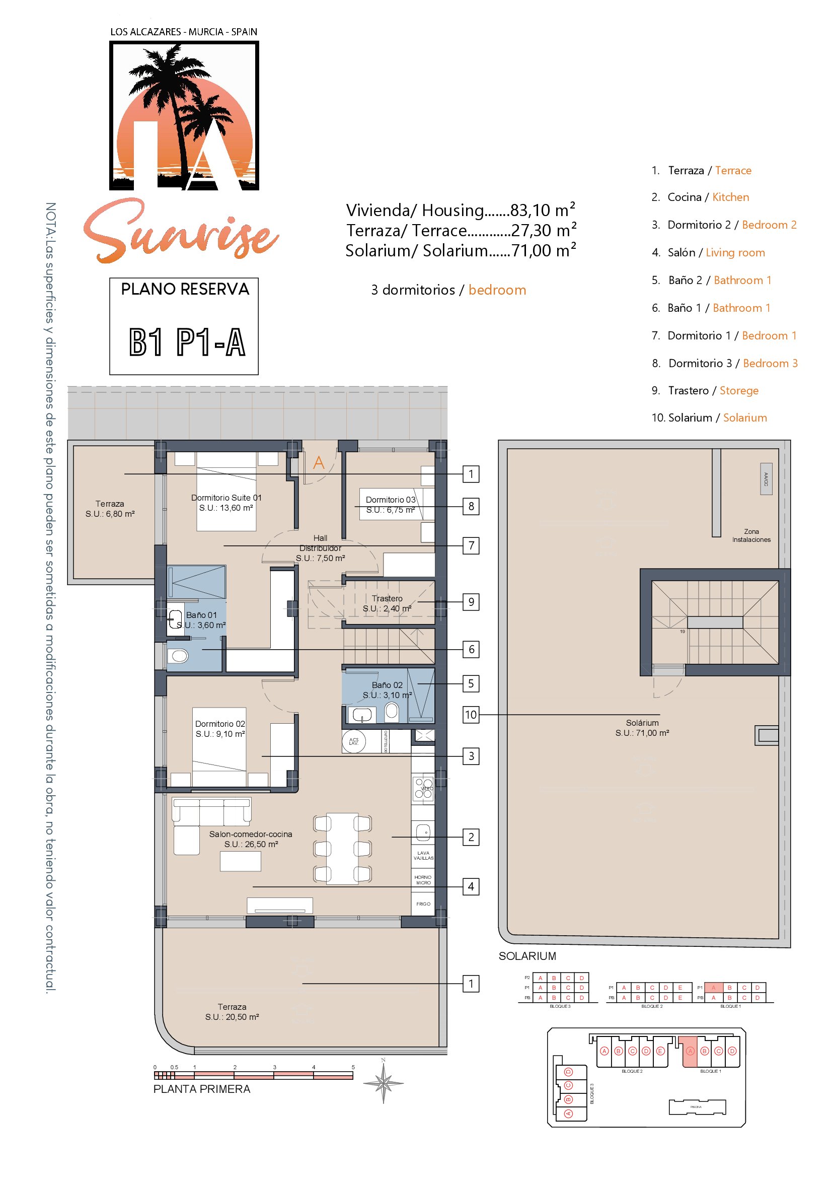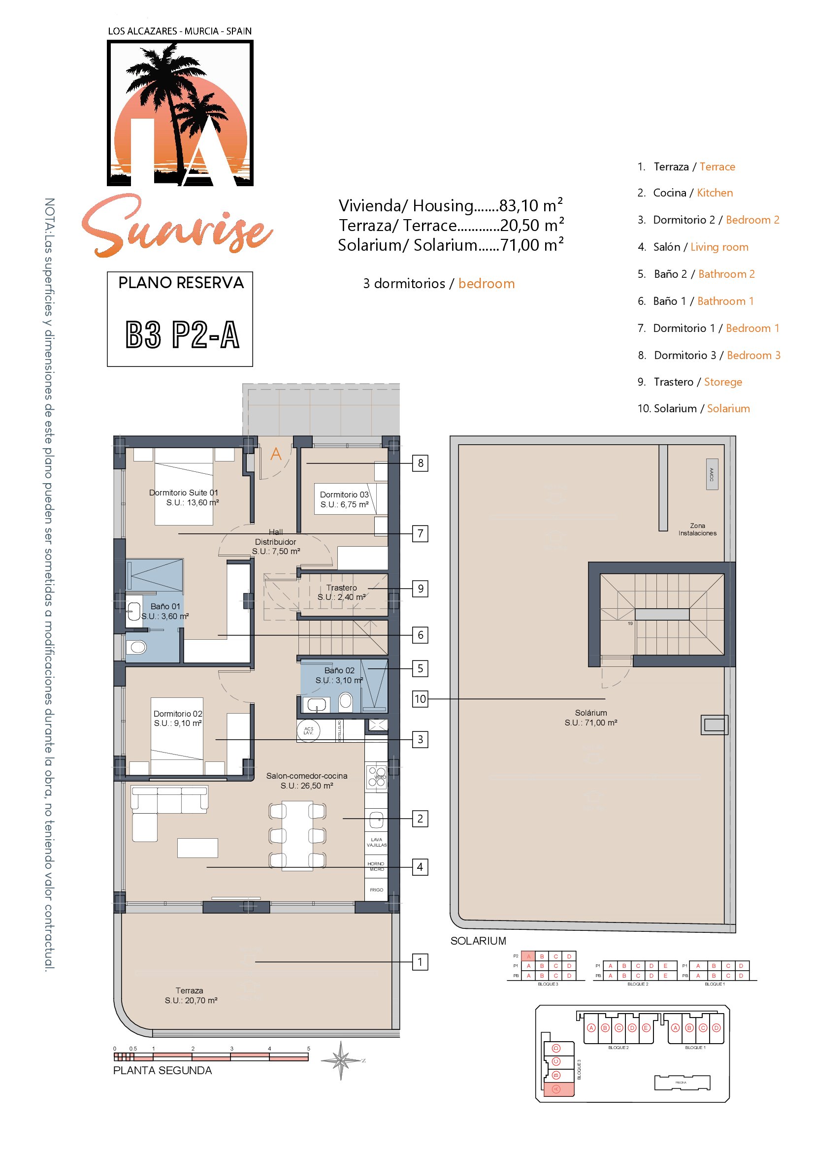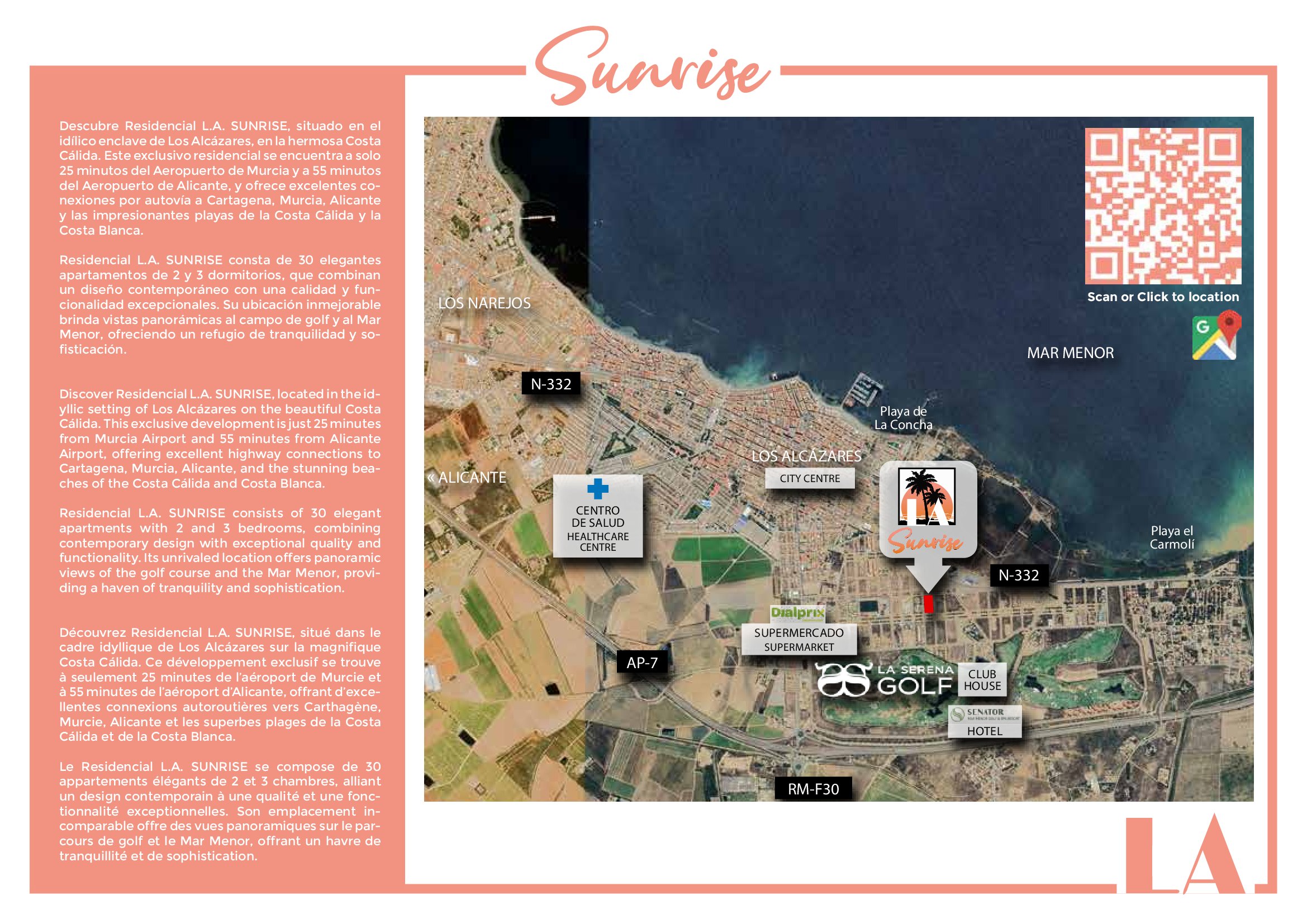 LA Sunrise Apartments have 3 blocks of apartments totaling 30 units with a choice of 3 & 2 bedrooms apartments with 2 bathrooms + private terrace, roof solarium to top floor units plus communal swimming pool and allocated parking. Penthouse units include very impressive roof solariums with outstanding panoramic views over the golf course and the Mar Menor.