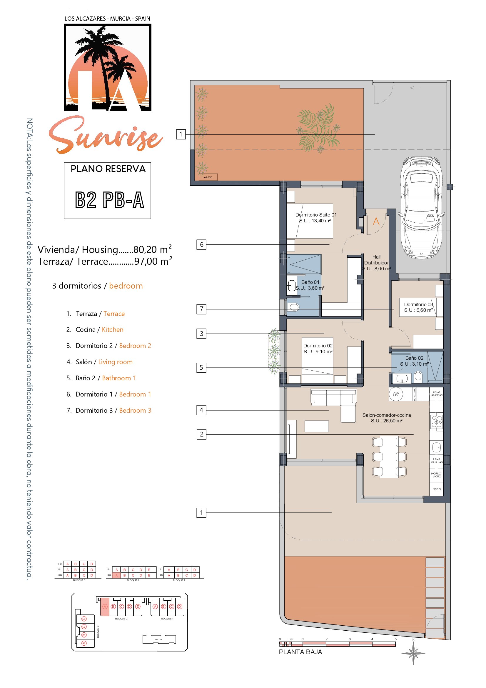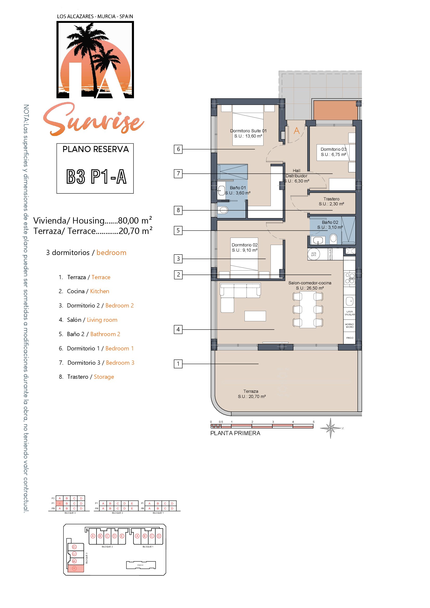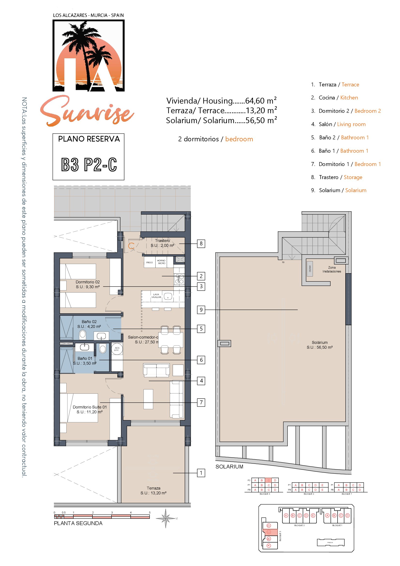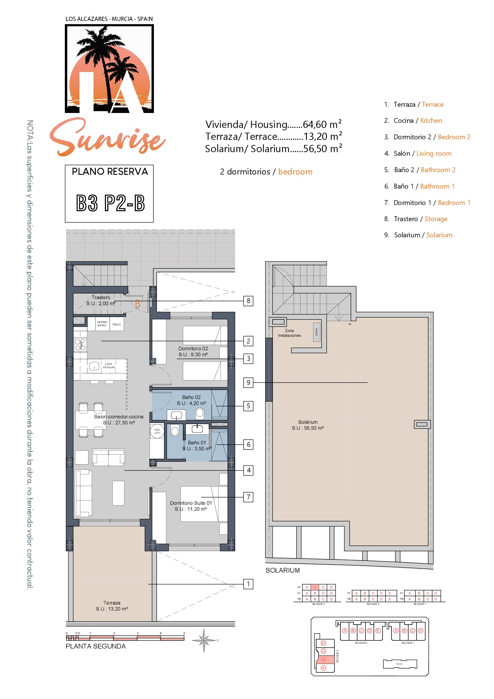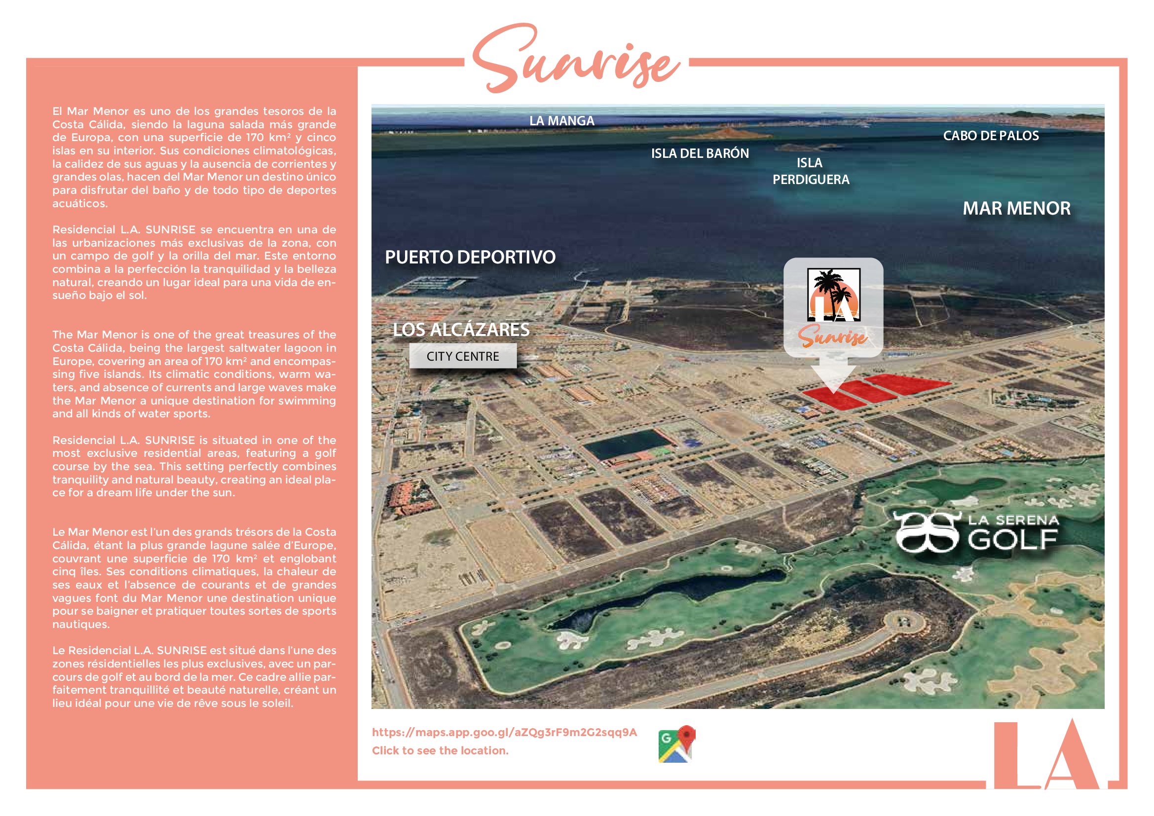 LA Sunrise Apartments have 3 blocks of apartments totaling 30 units with a choice of 3 & 2 bedrooms apartments with 2 bathrooms + private terrace, roof solarium to top floor units plus communal swimming pool and allocated parking. Penthouse units include very impressive roof solariums with outstanding panoramic views over the golf course and the Mar Menor.