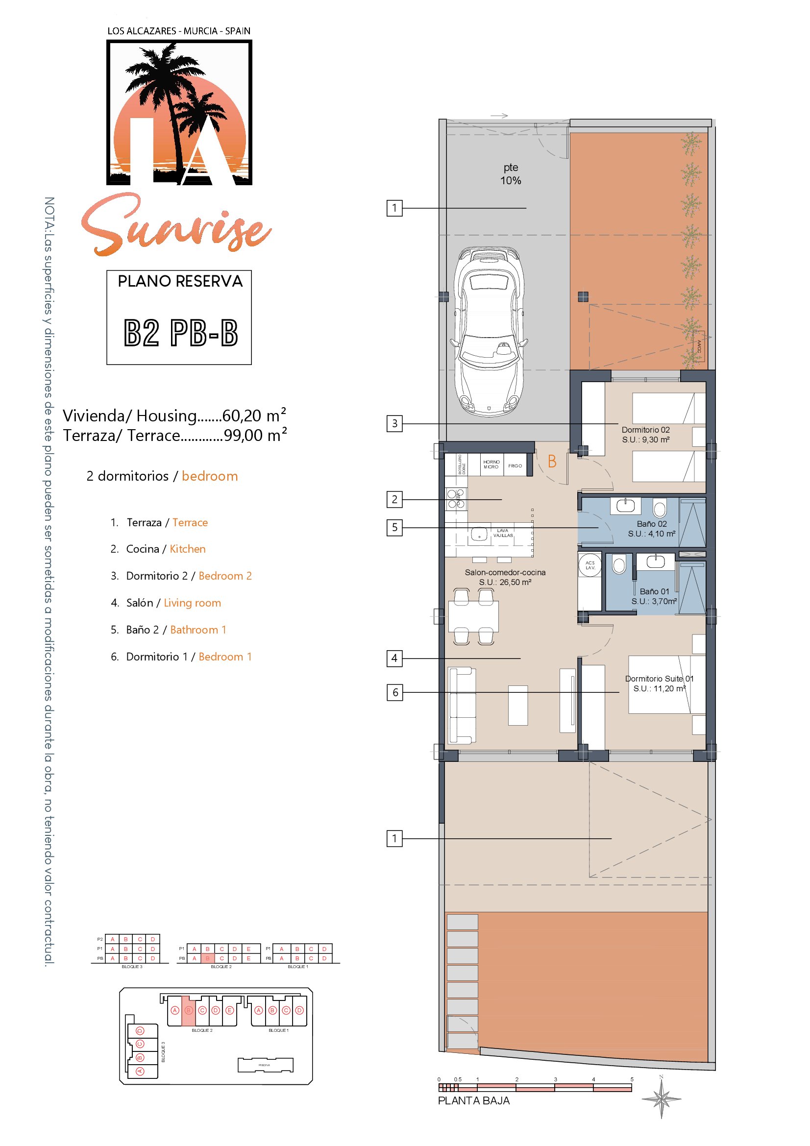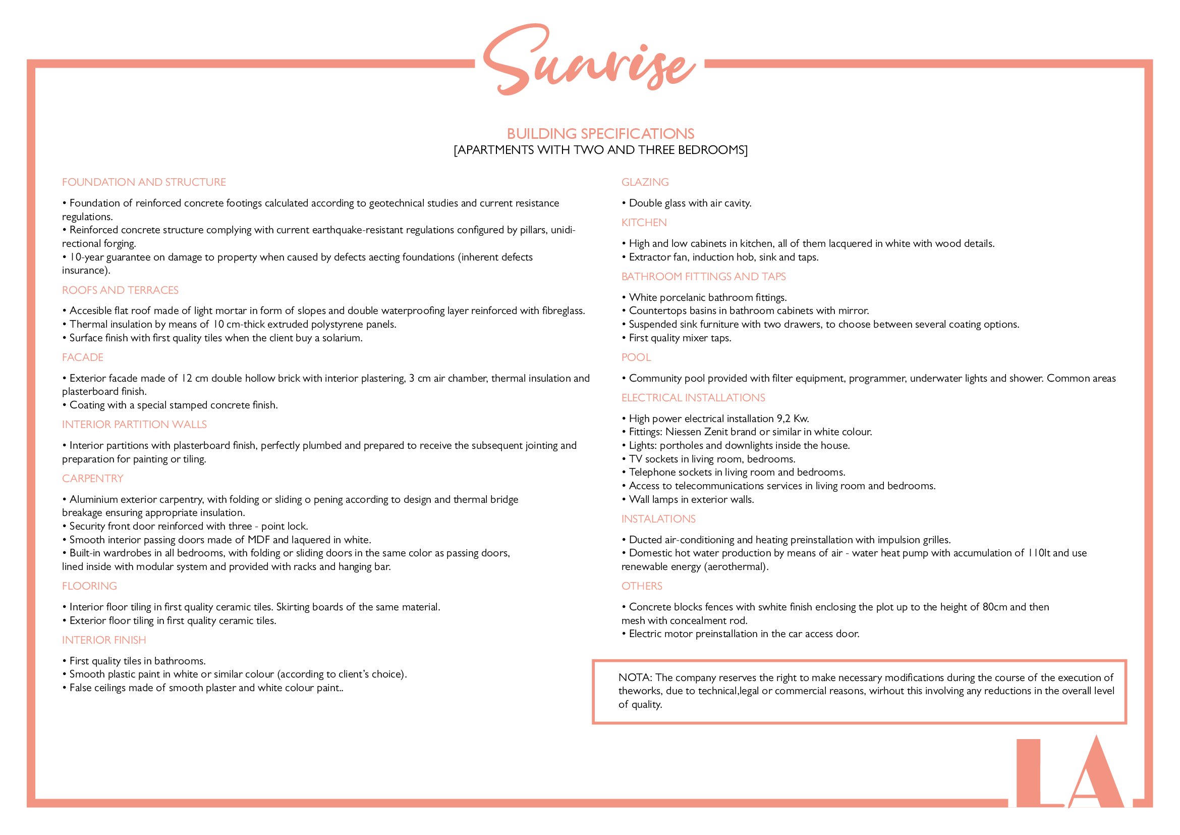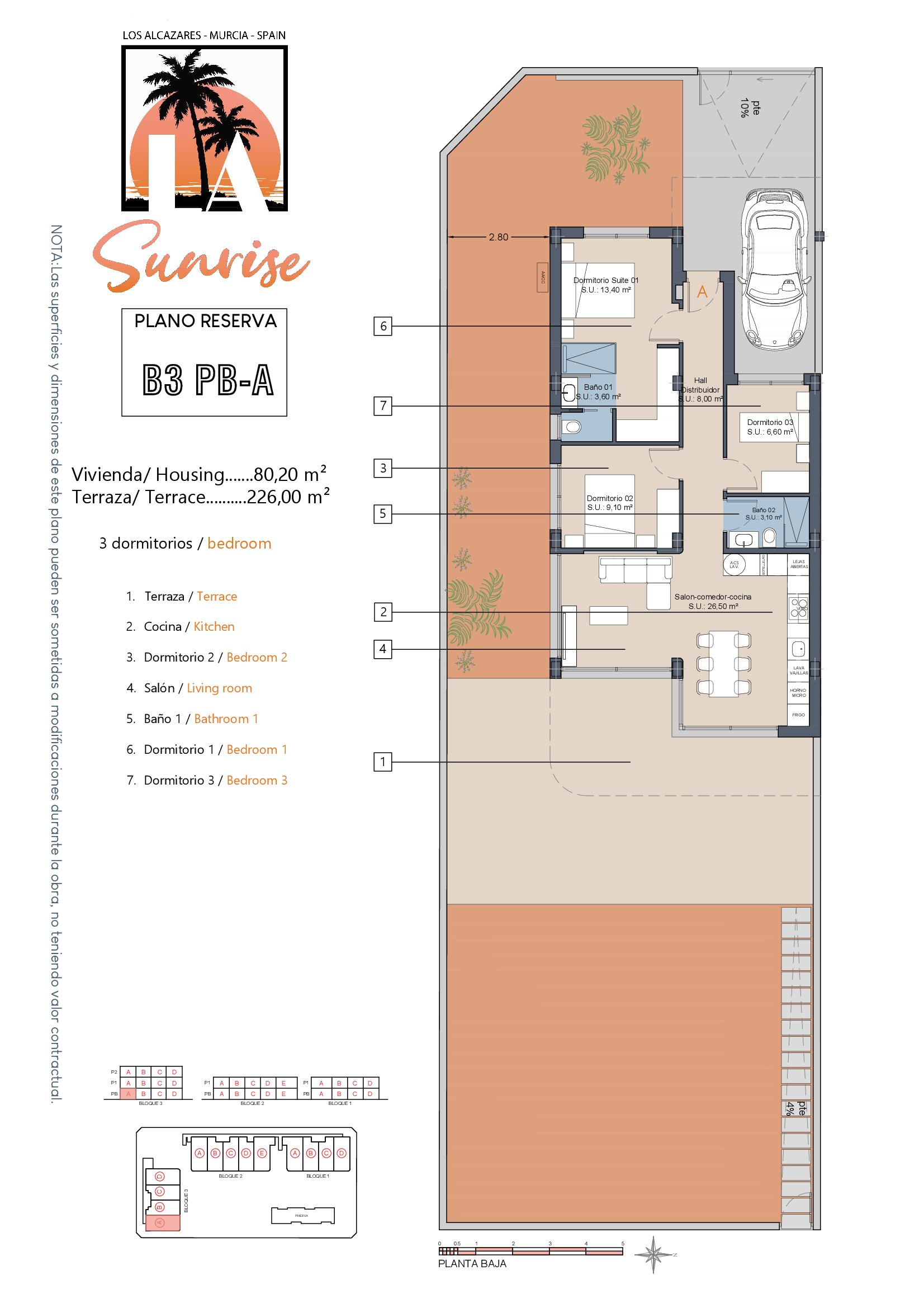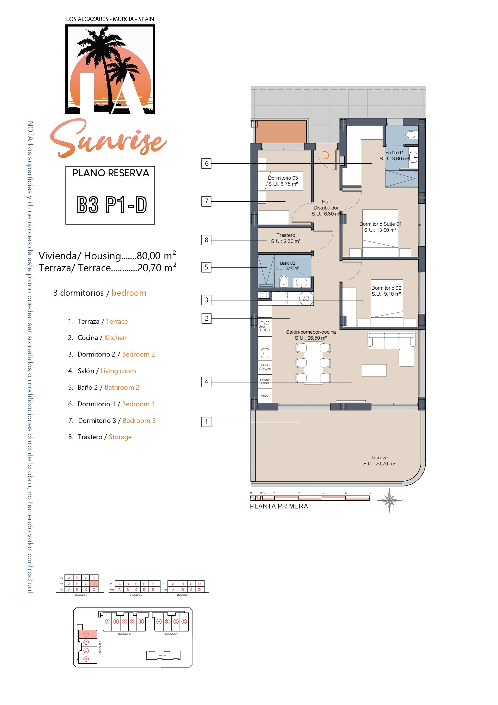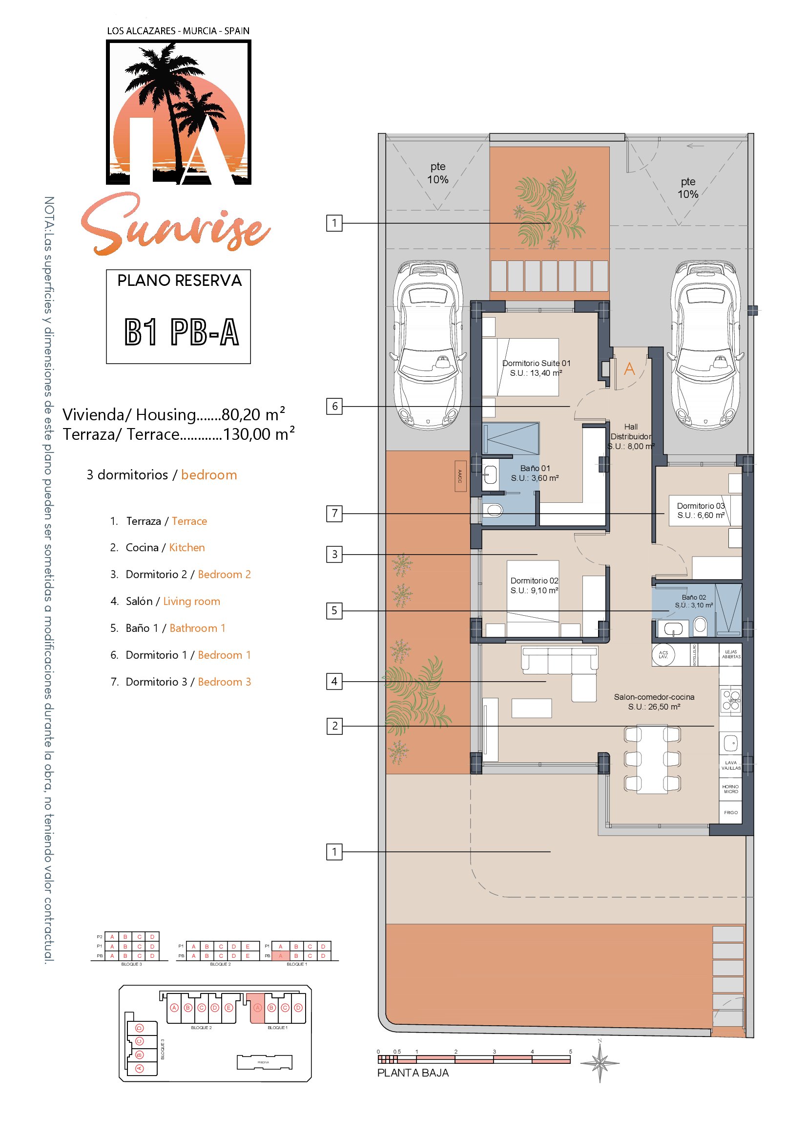 LA Sunrise Apartments have 3 blocks of apartments totaling 30 units with a choice of 3 & 2 bedrooms apartments with 2 bathrooms + private terrace, roof solarium to top floor units plus communal swimming pool and allocated parking. Penthouse units include very impressive roof solariums with outstanding panoramic views over the golf course and the Mar Menor.