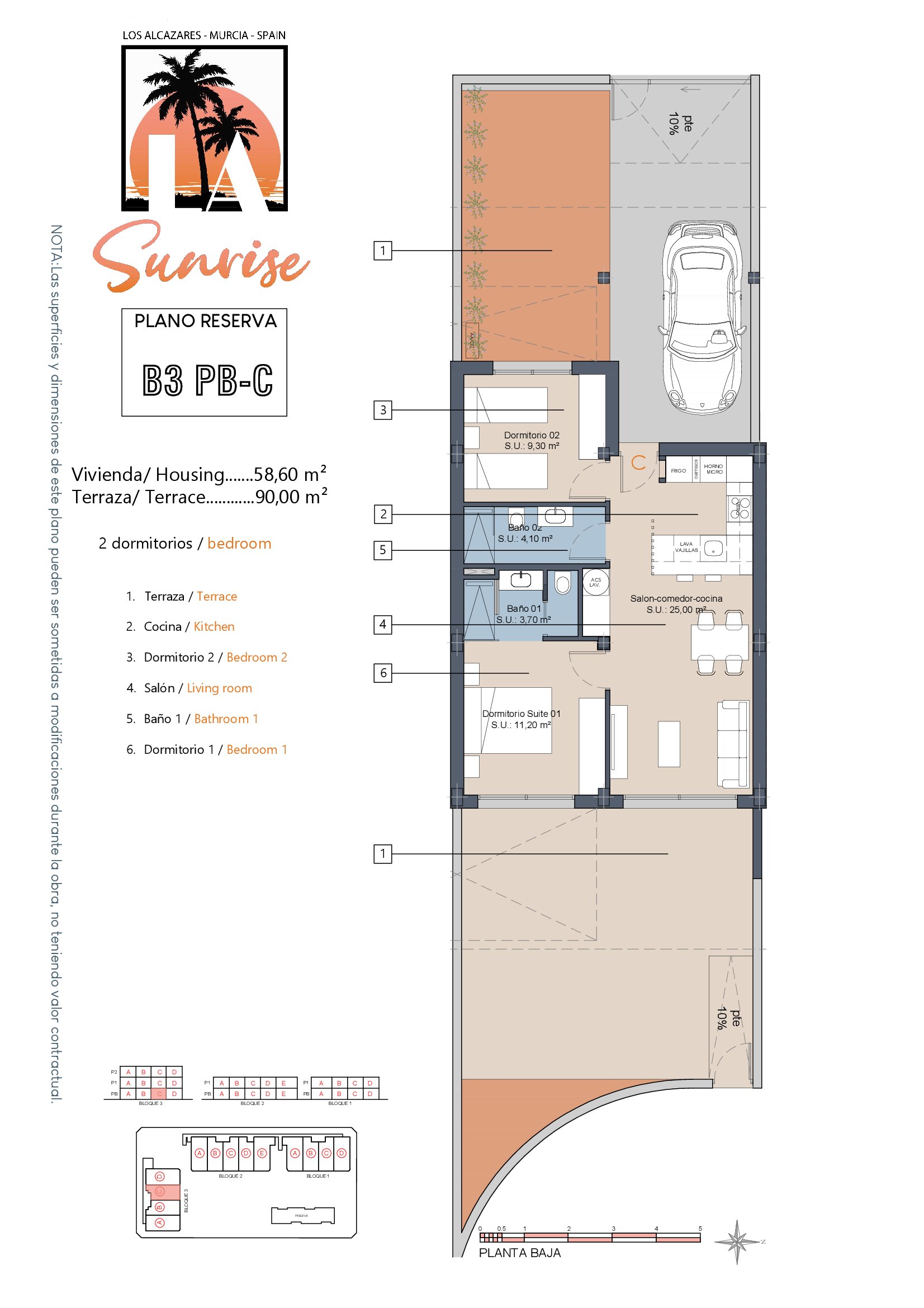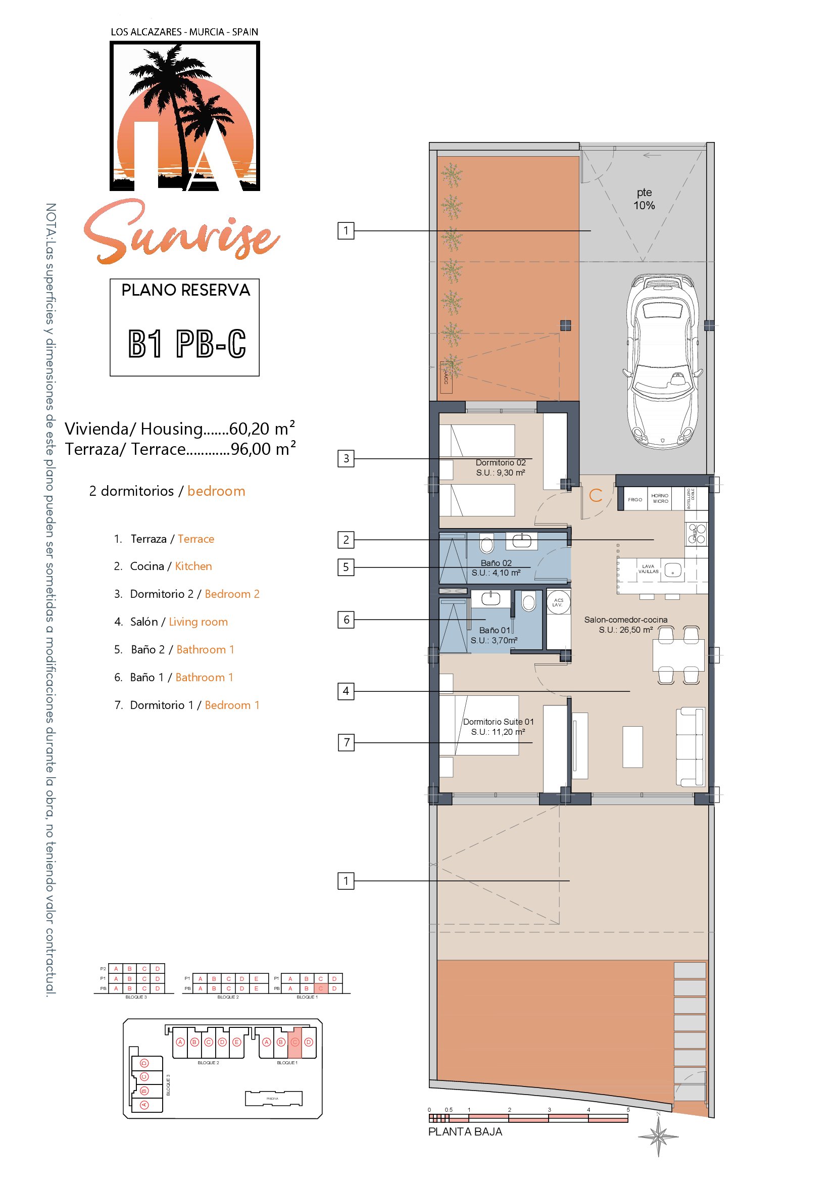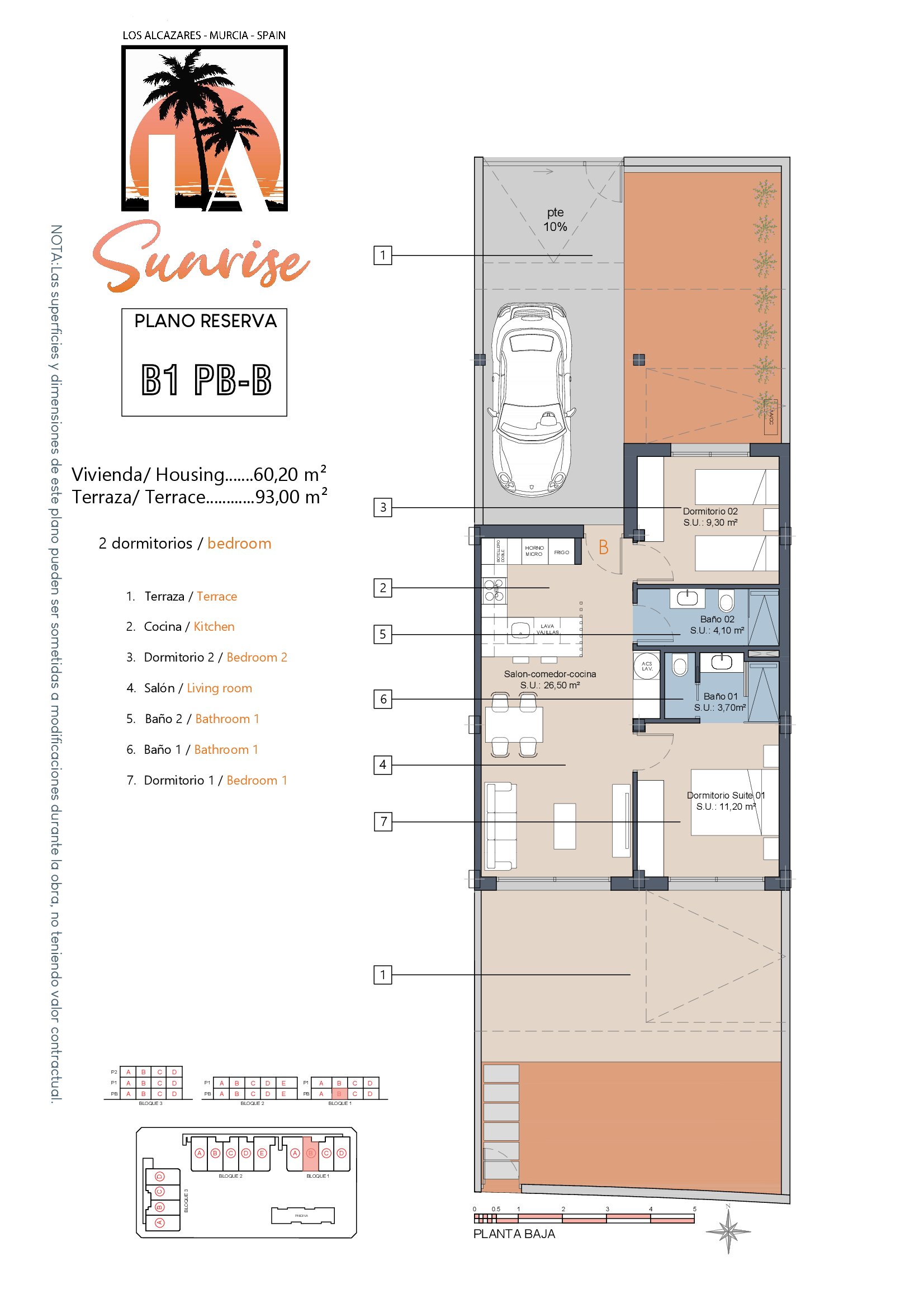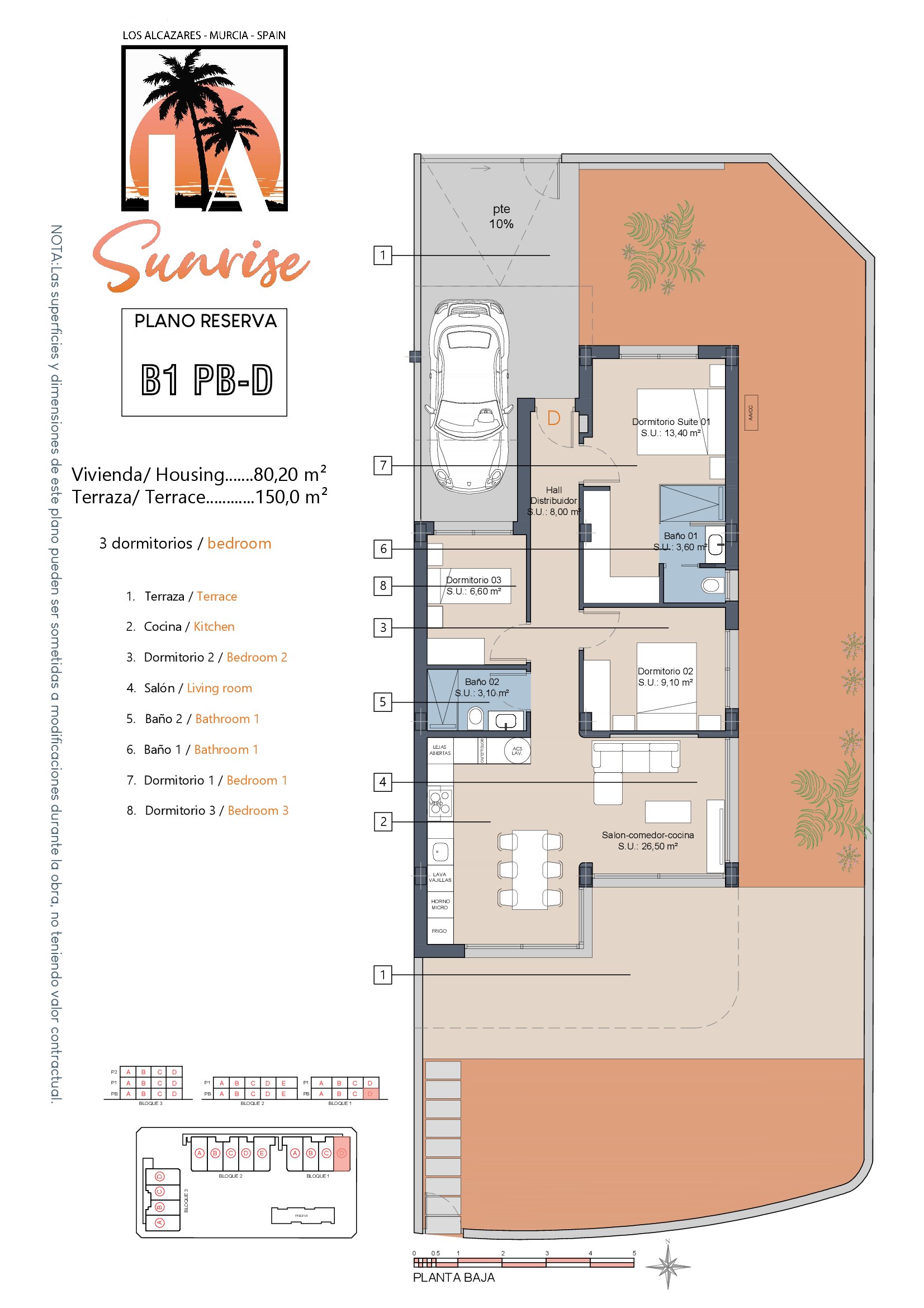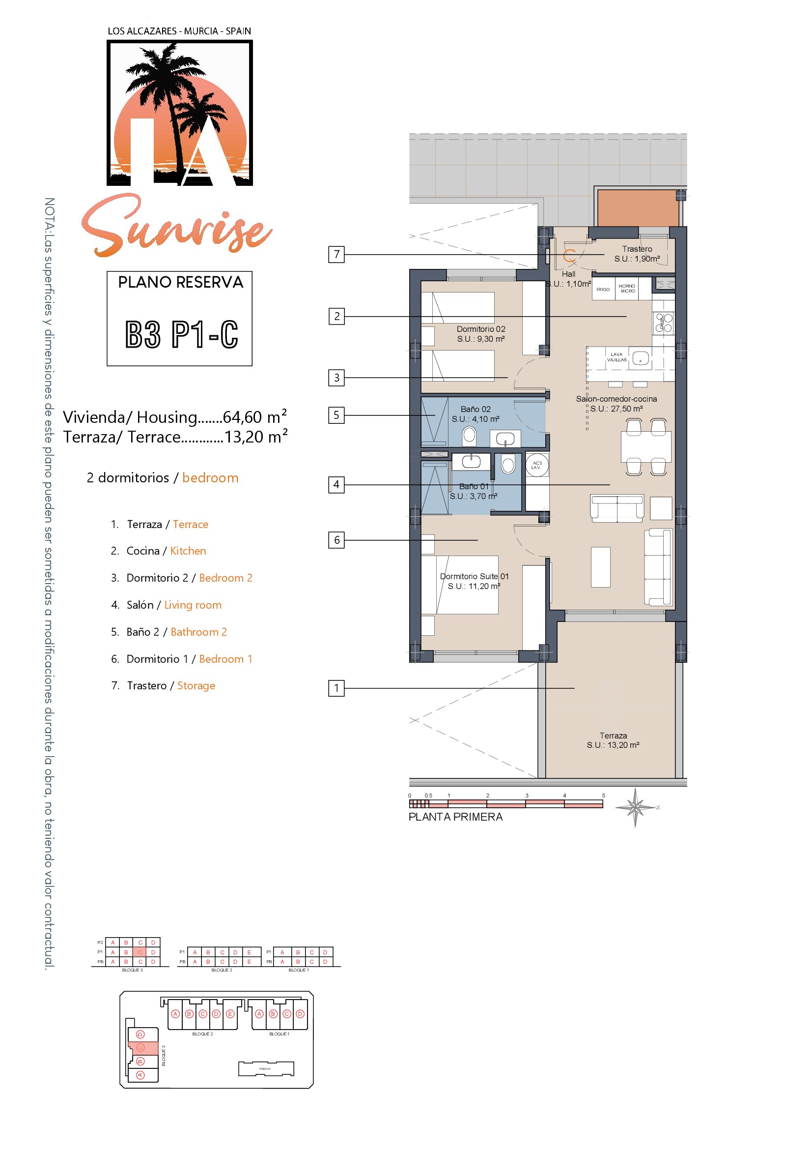 LA Sunrise Apartments have 3 blocks of apartments totaling 30 units with a choice of 3 & 2 bedrooms apartments with 2 bathrooms + private terrace, roof solarium to top floor units plus communal swimming pool and allocated parking. Penthouse units include very impressive roof solariums with outstanding panoramic views over the golf course and the Mar Menor.