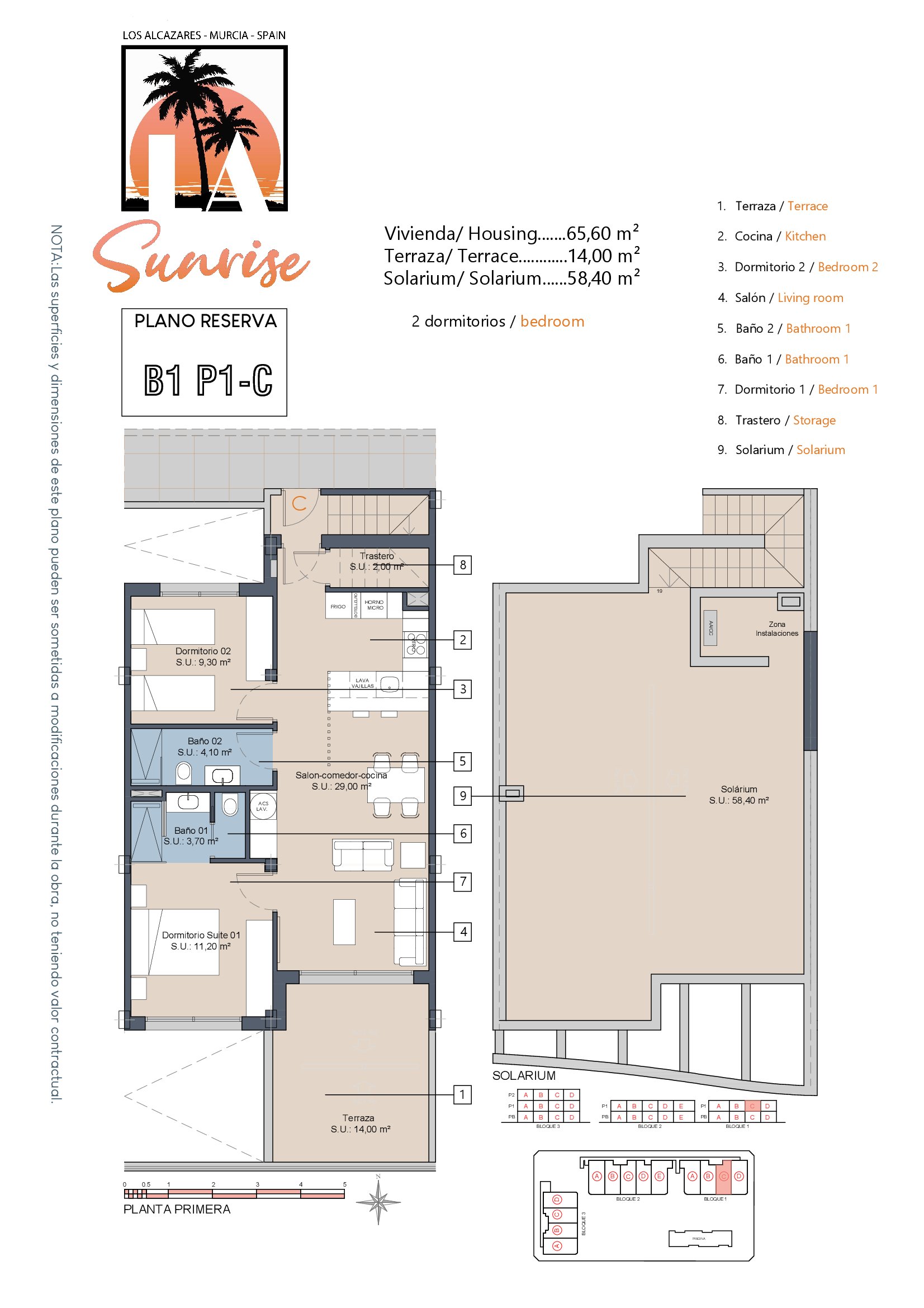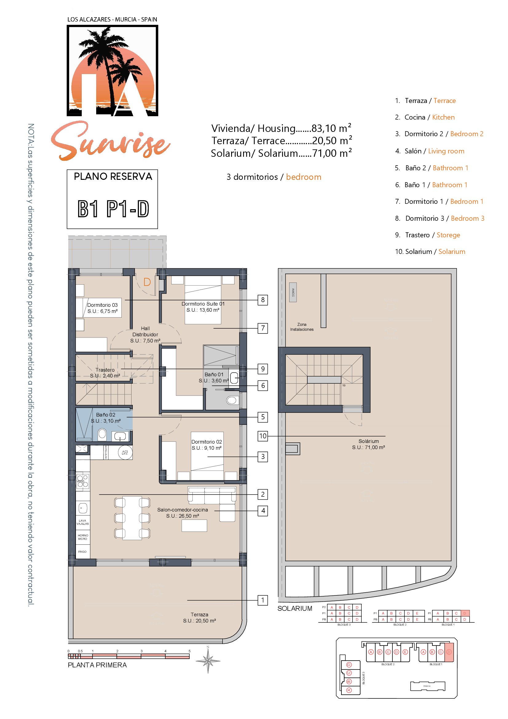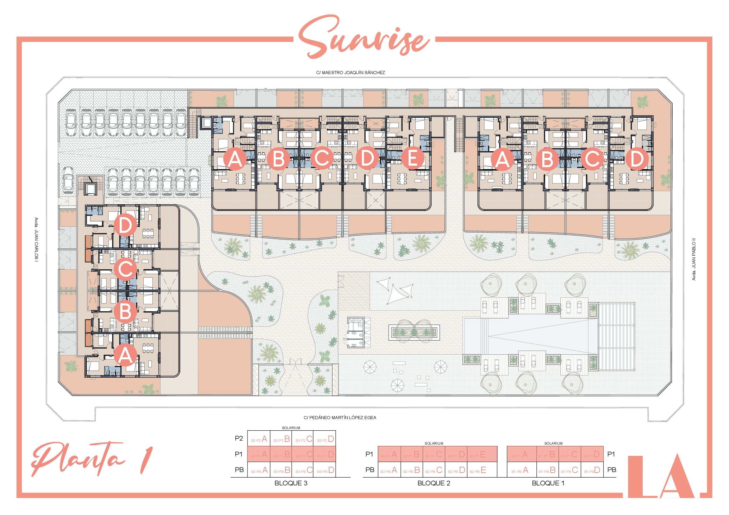 | Block 1 | Bed | Bath | Apartment m² | Terrace m² | Solarium m² | Price € +iva |