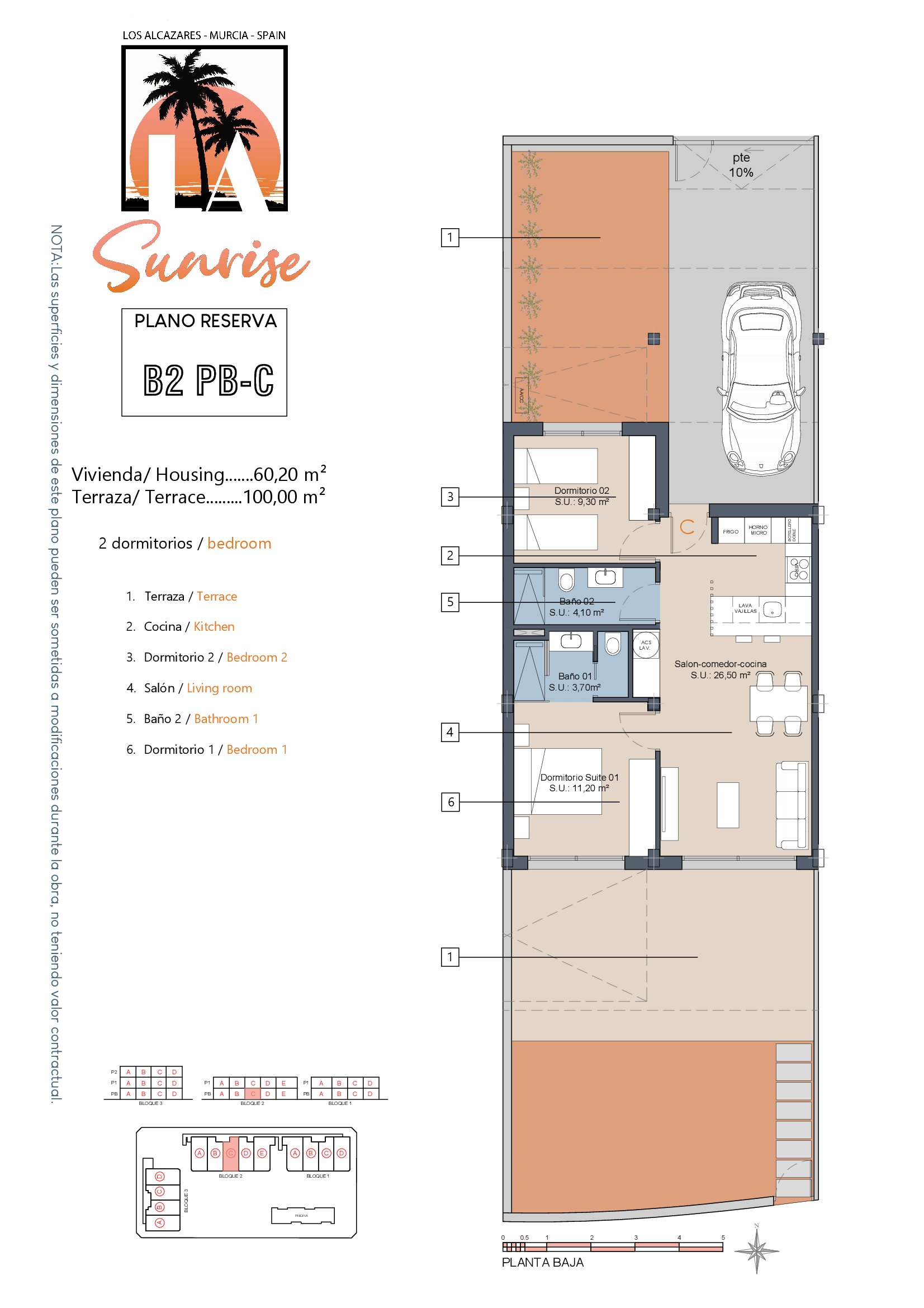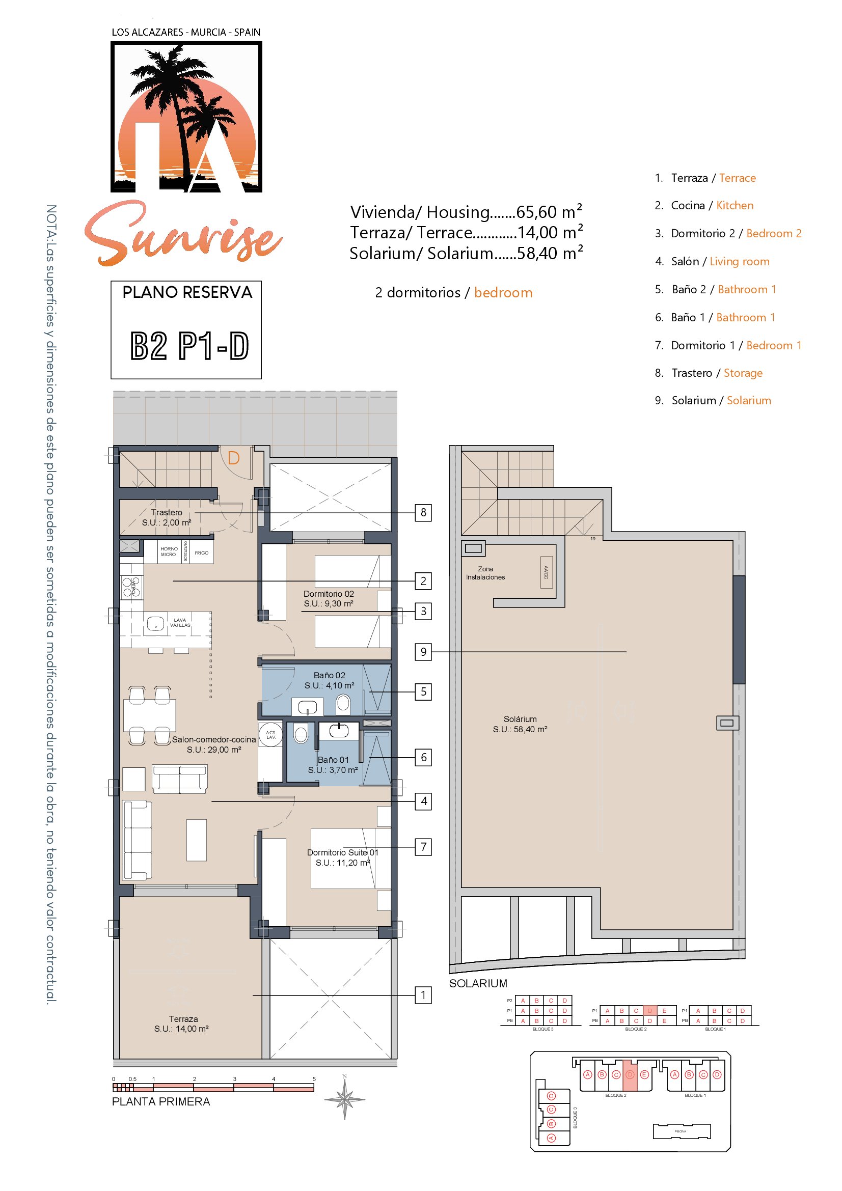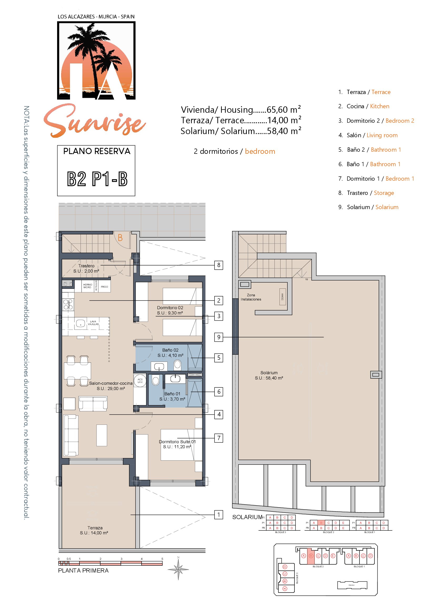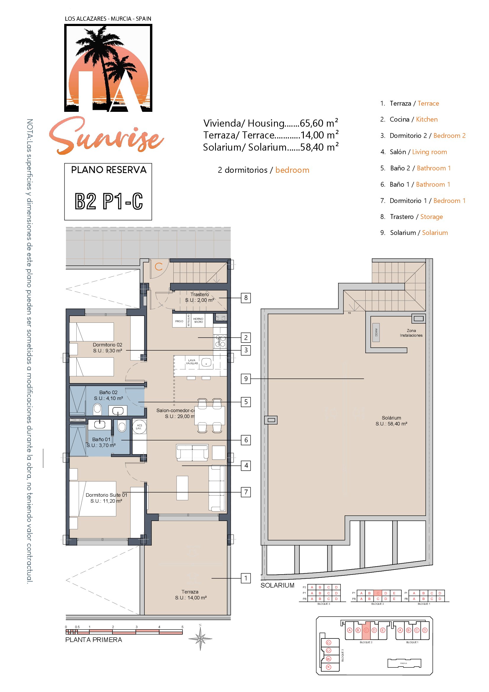 | Block 2 | Bed | Bath | Apartment m² | Terrace m² | Solarium m² | Price € +iva |
