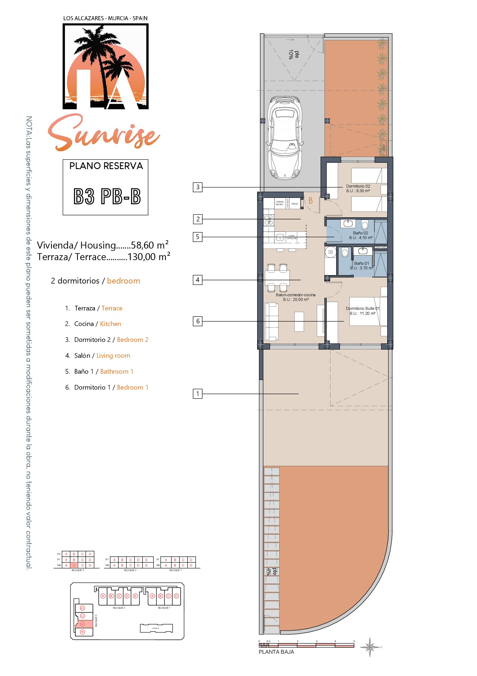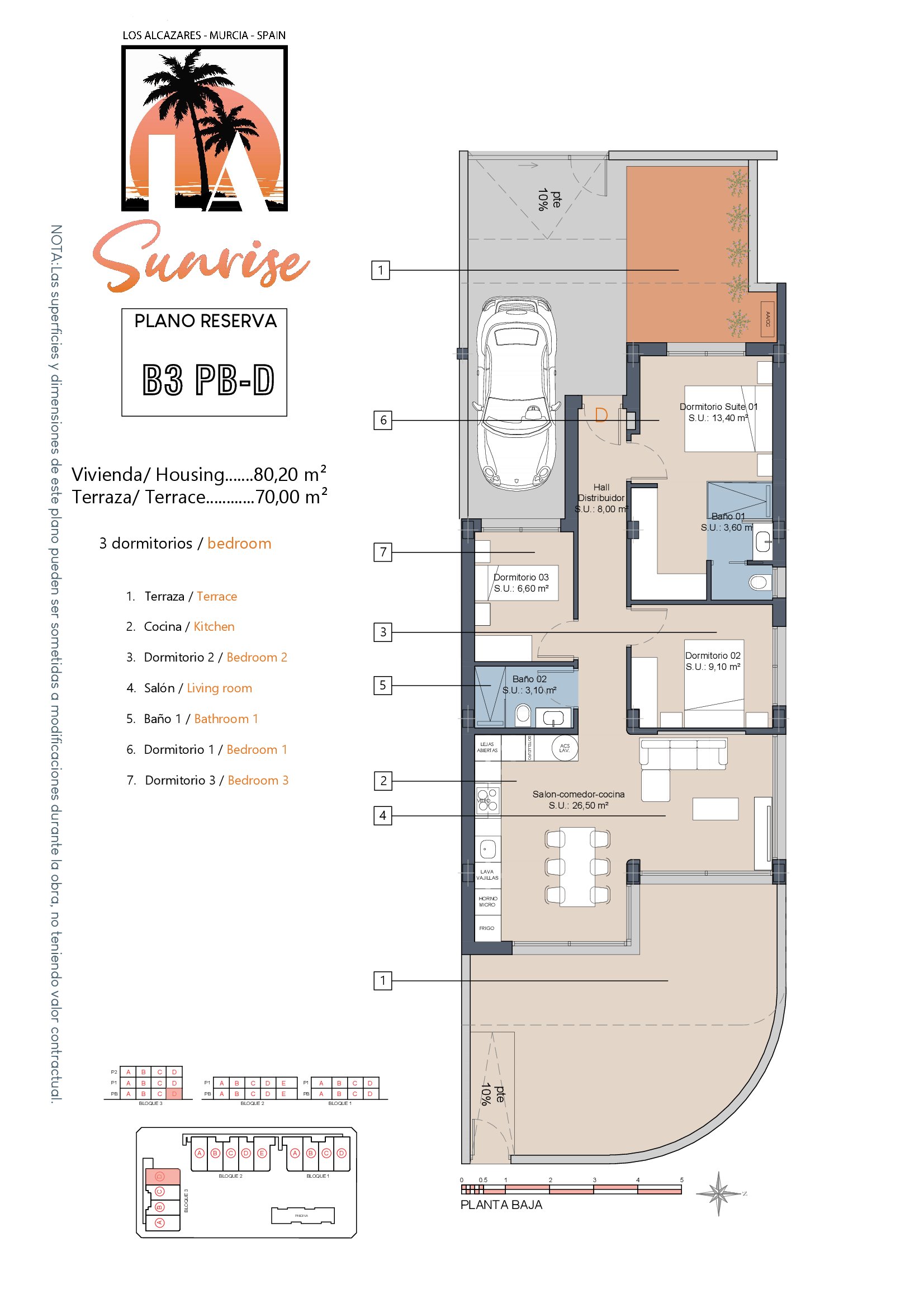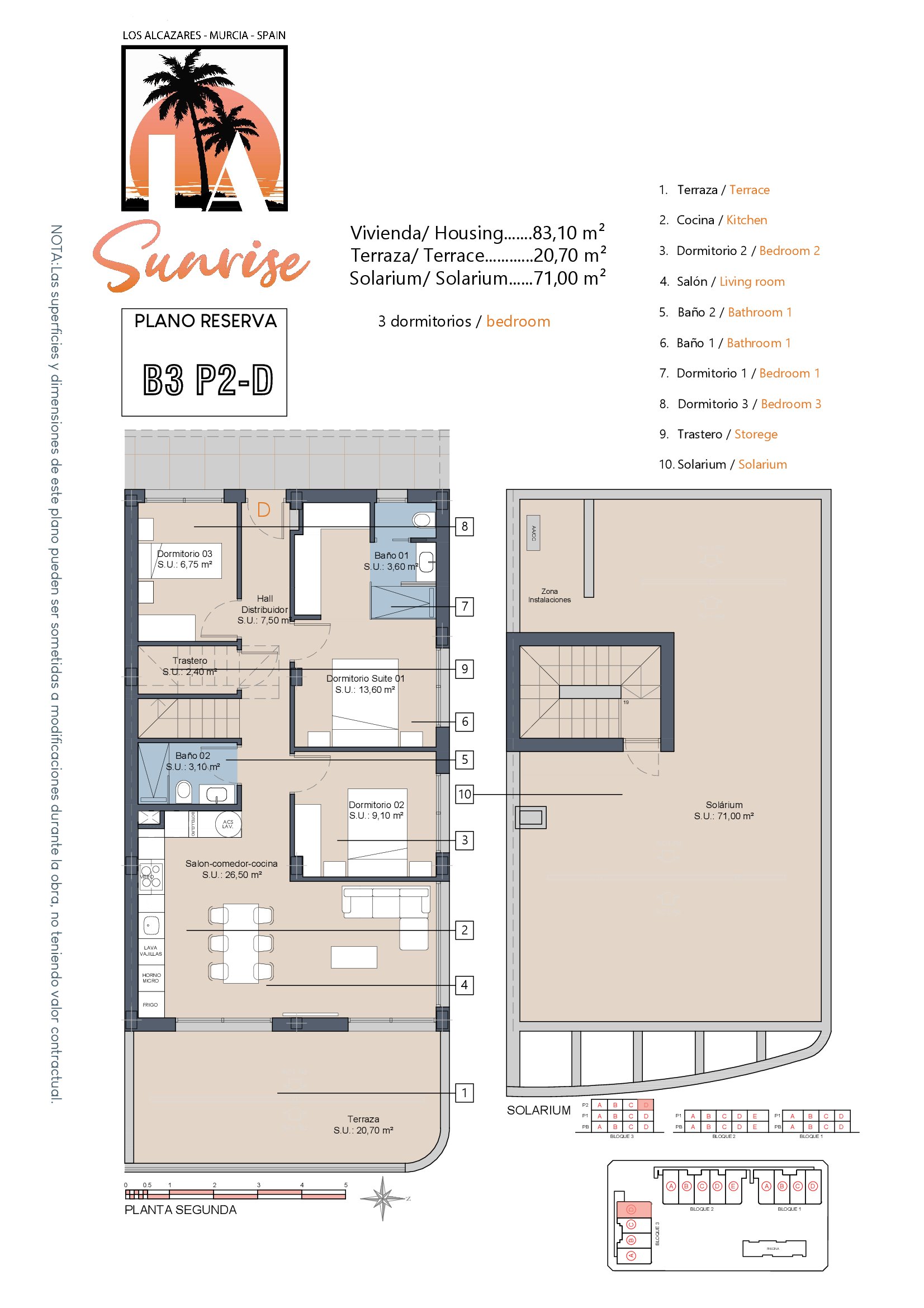 | Block 3 | Bed | Bath | Apartment m² | Terrace m² | Solarium m² | Price € +iva |